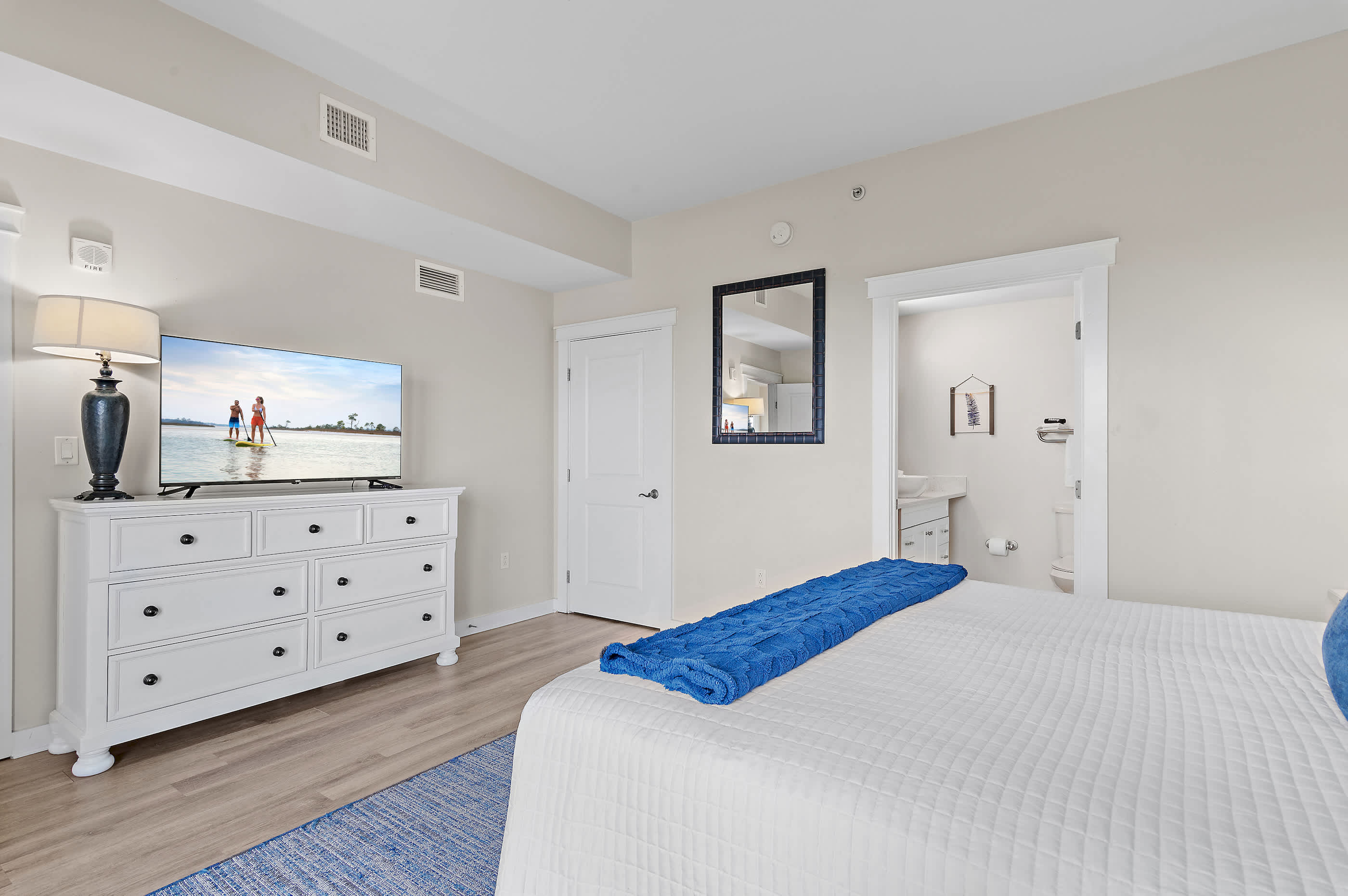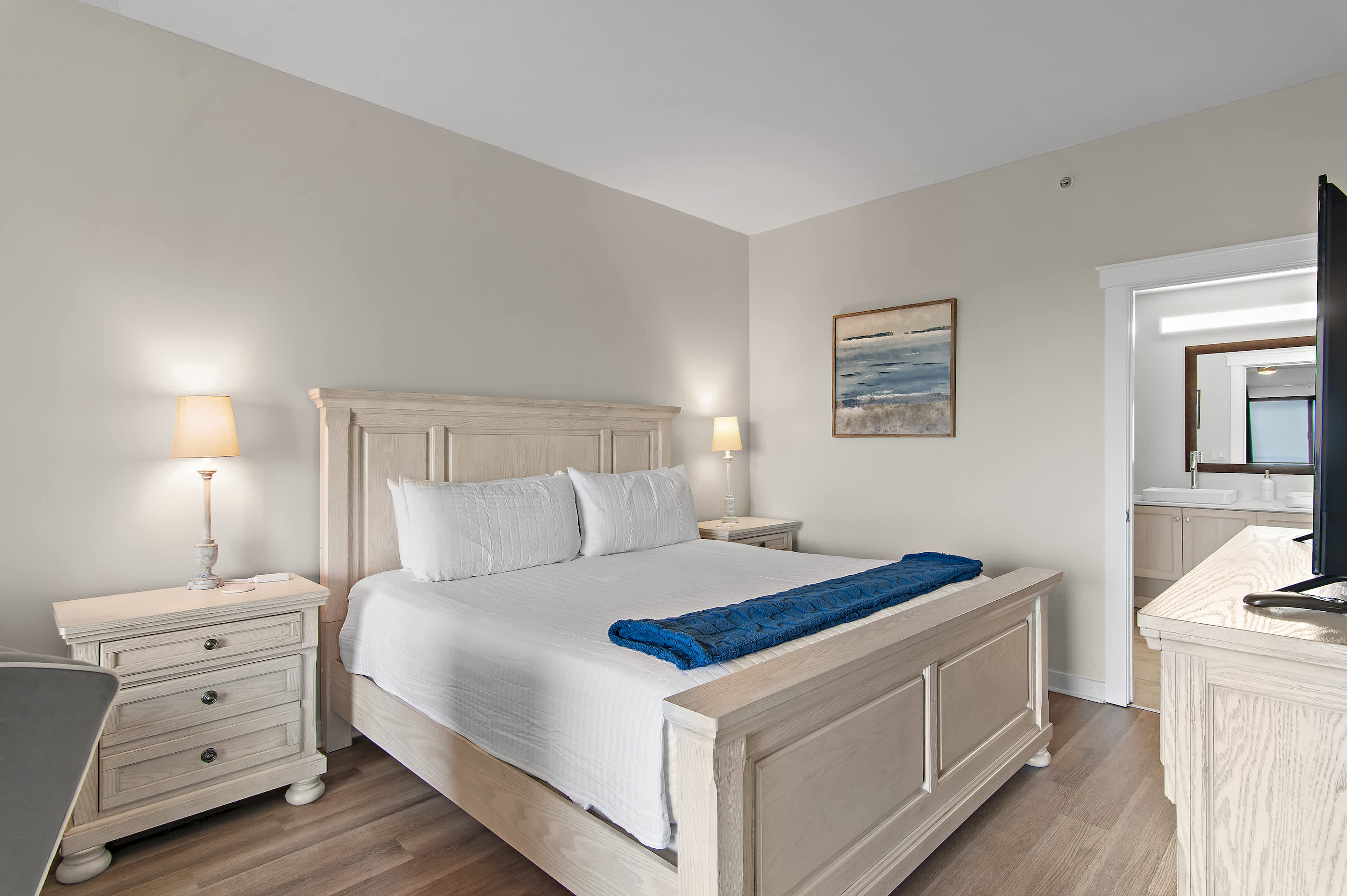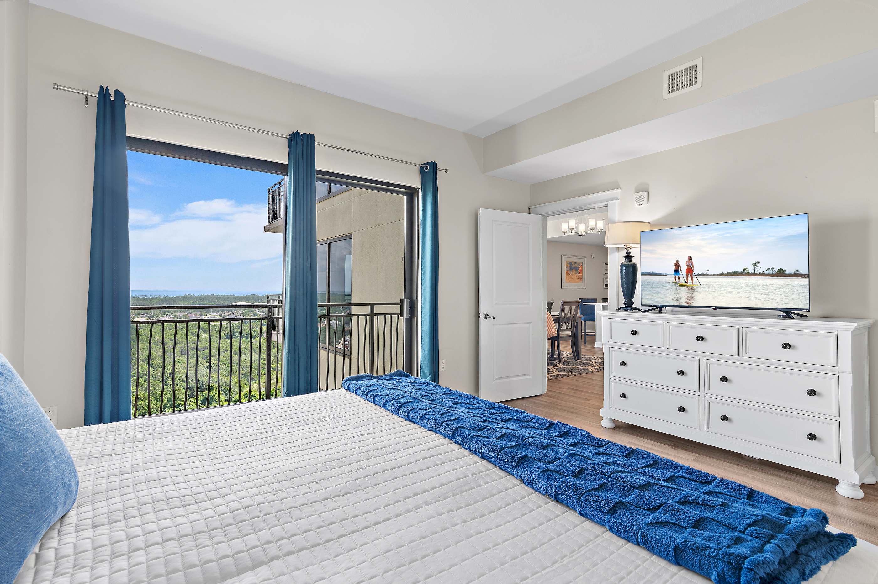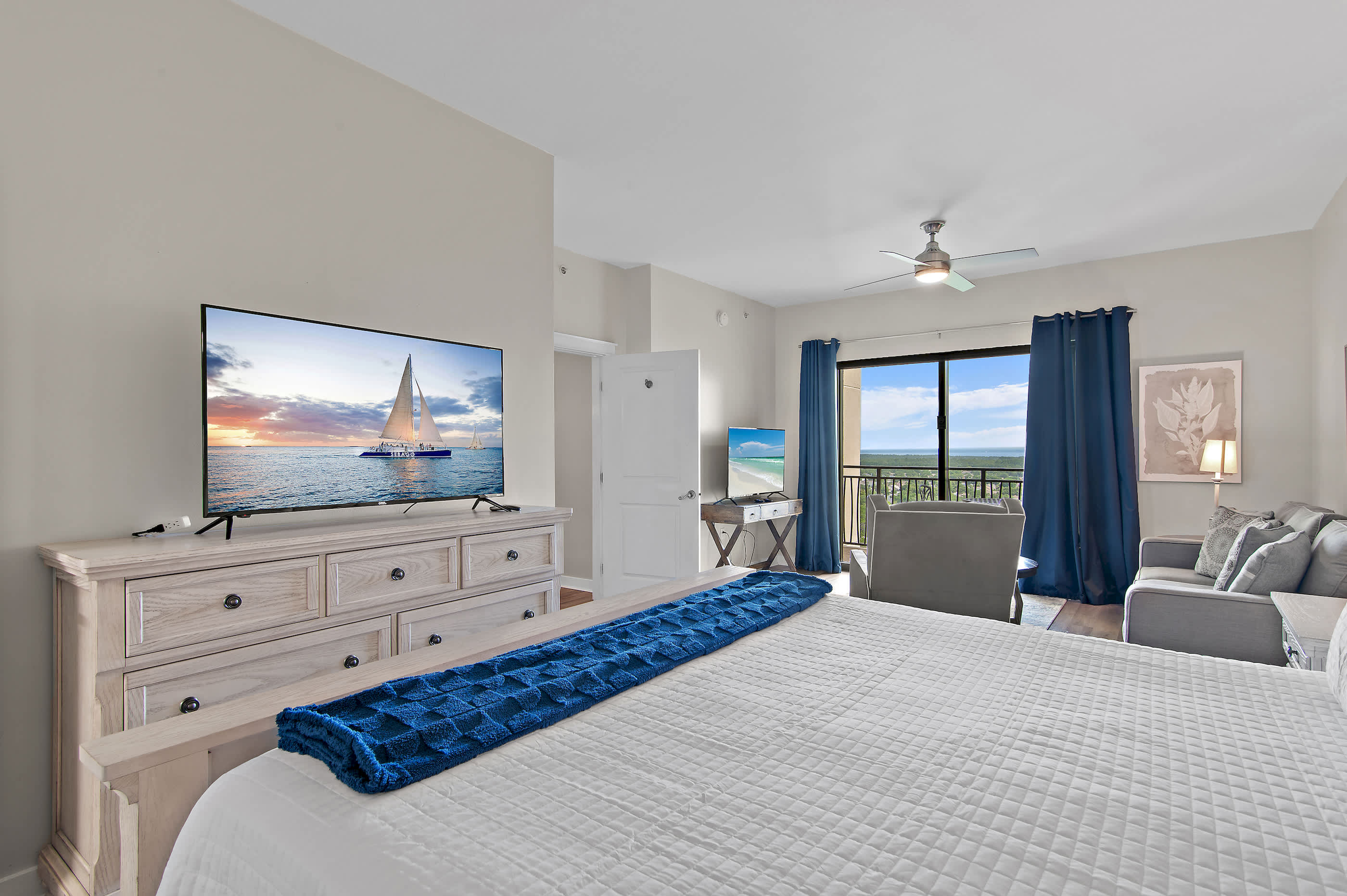 - Master Bedroom: King bed, bonus sitting area, walk-in closet, en-suite bathroom, and private balcony