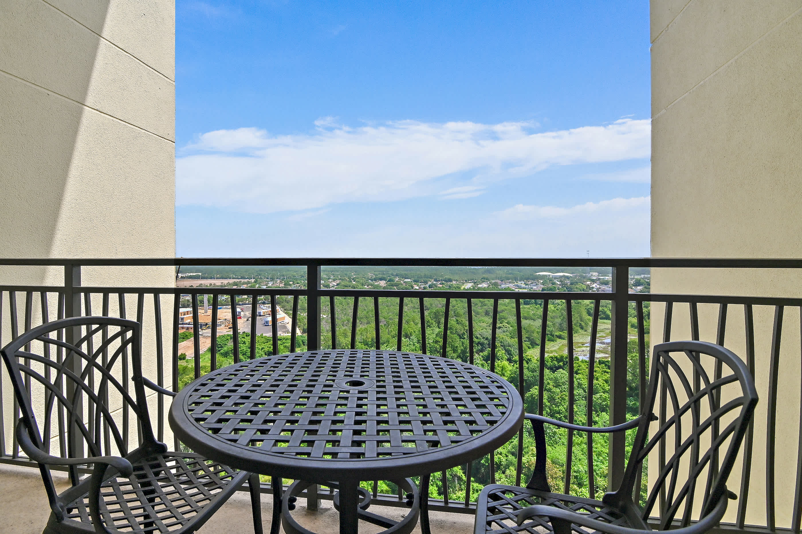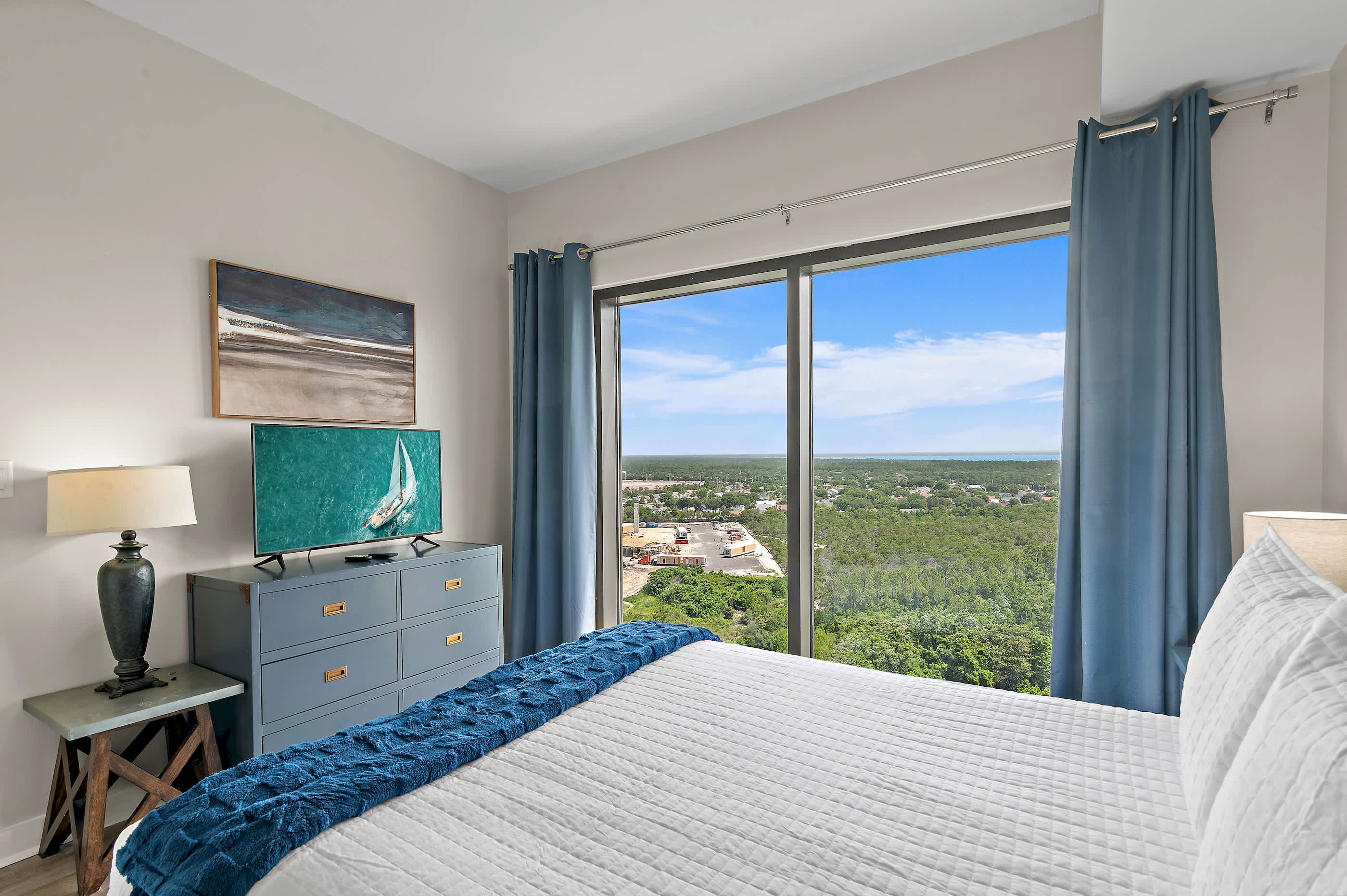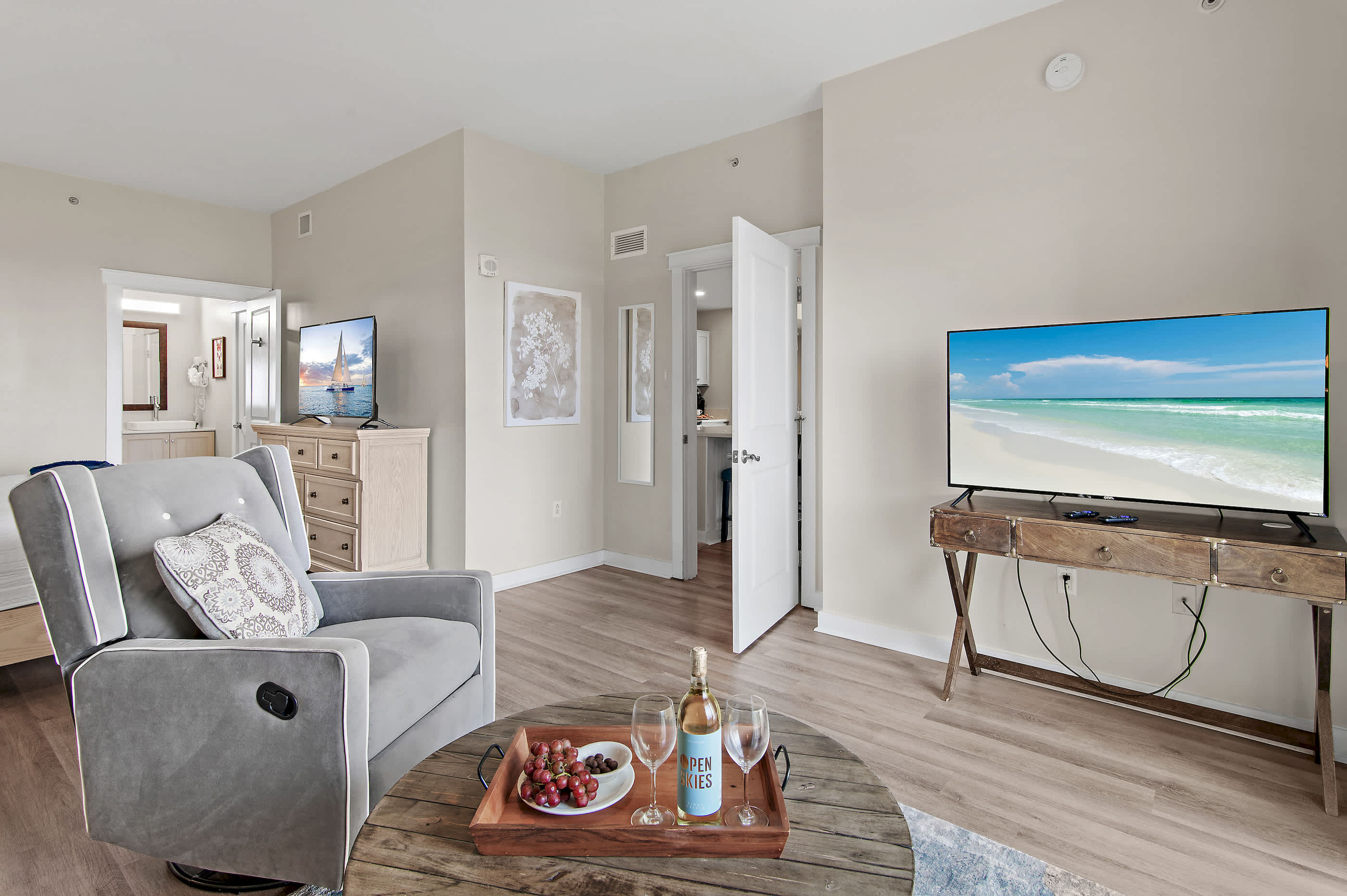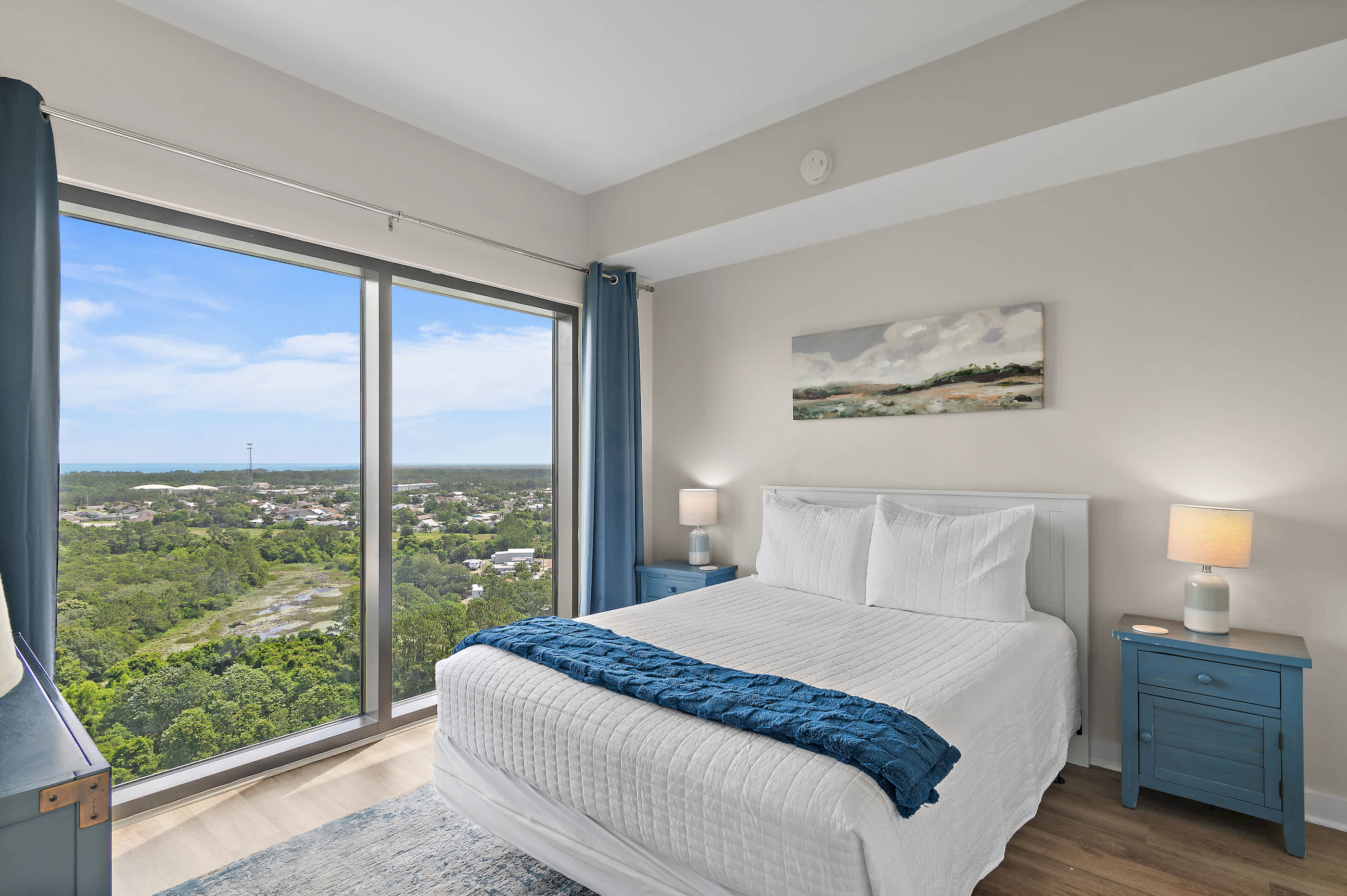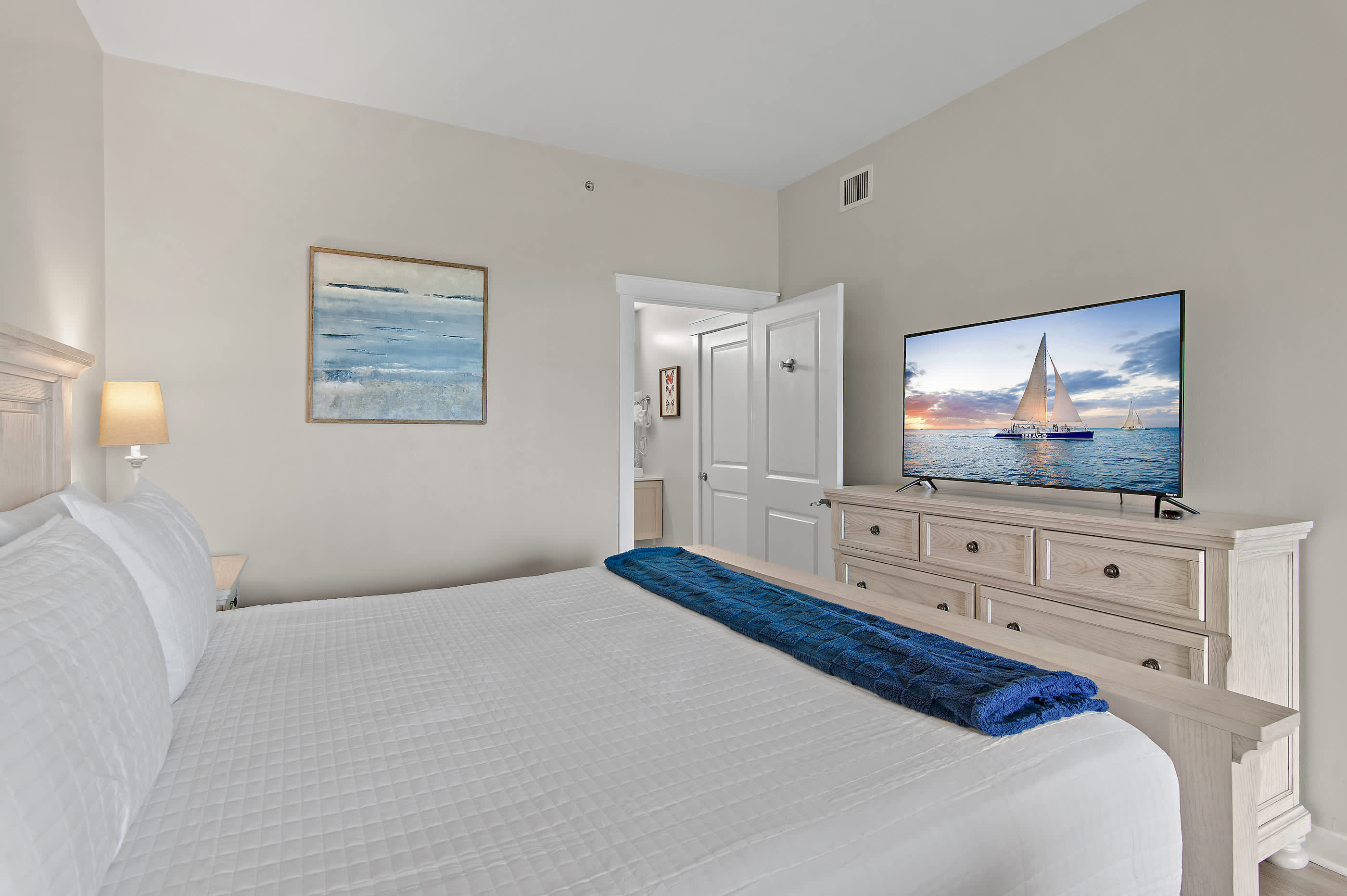 - Master Bedroom: King bed, bonus sitting area, walk-in closet, en-suite bathroom, and private balcony