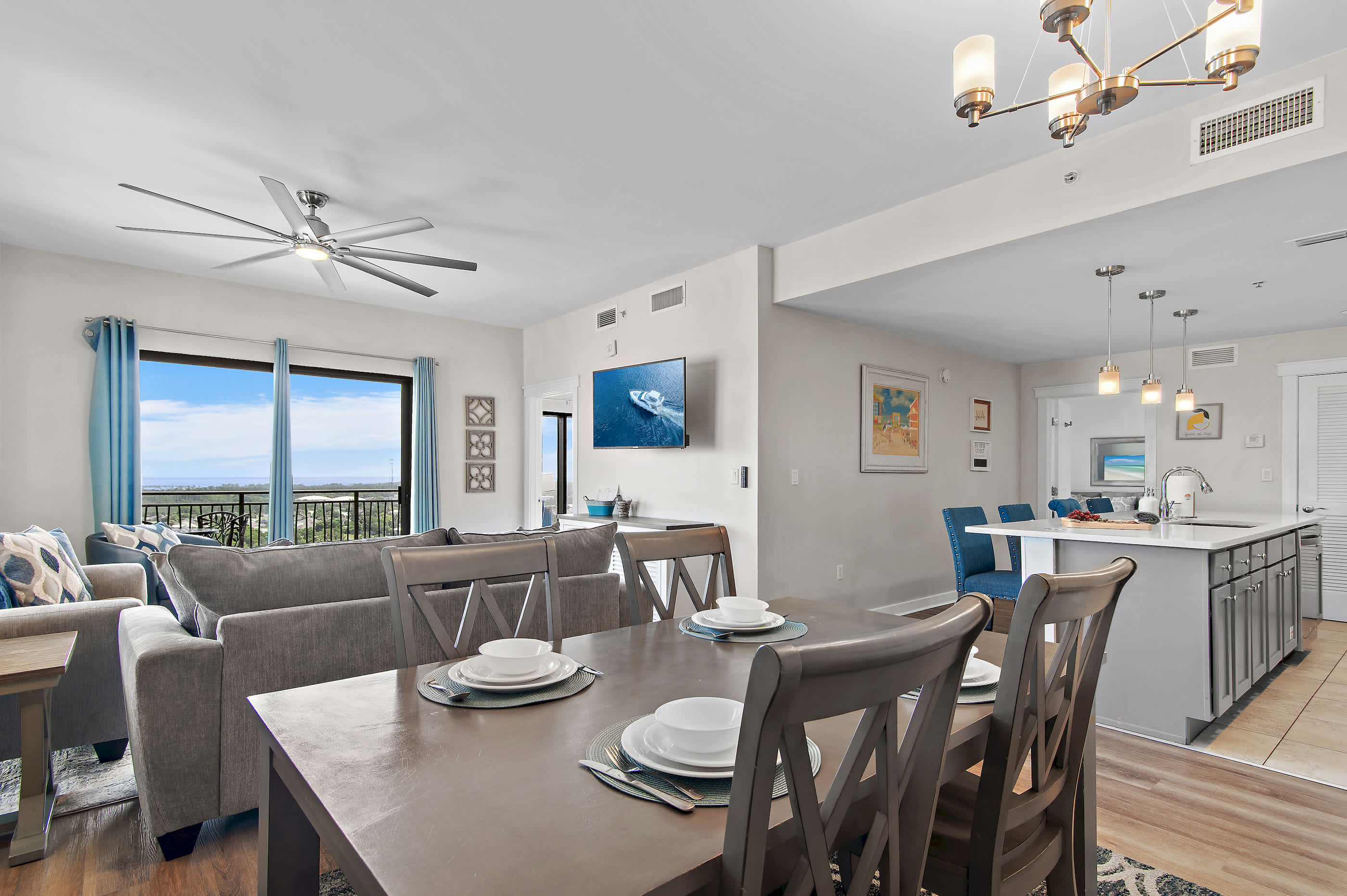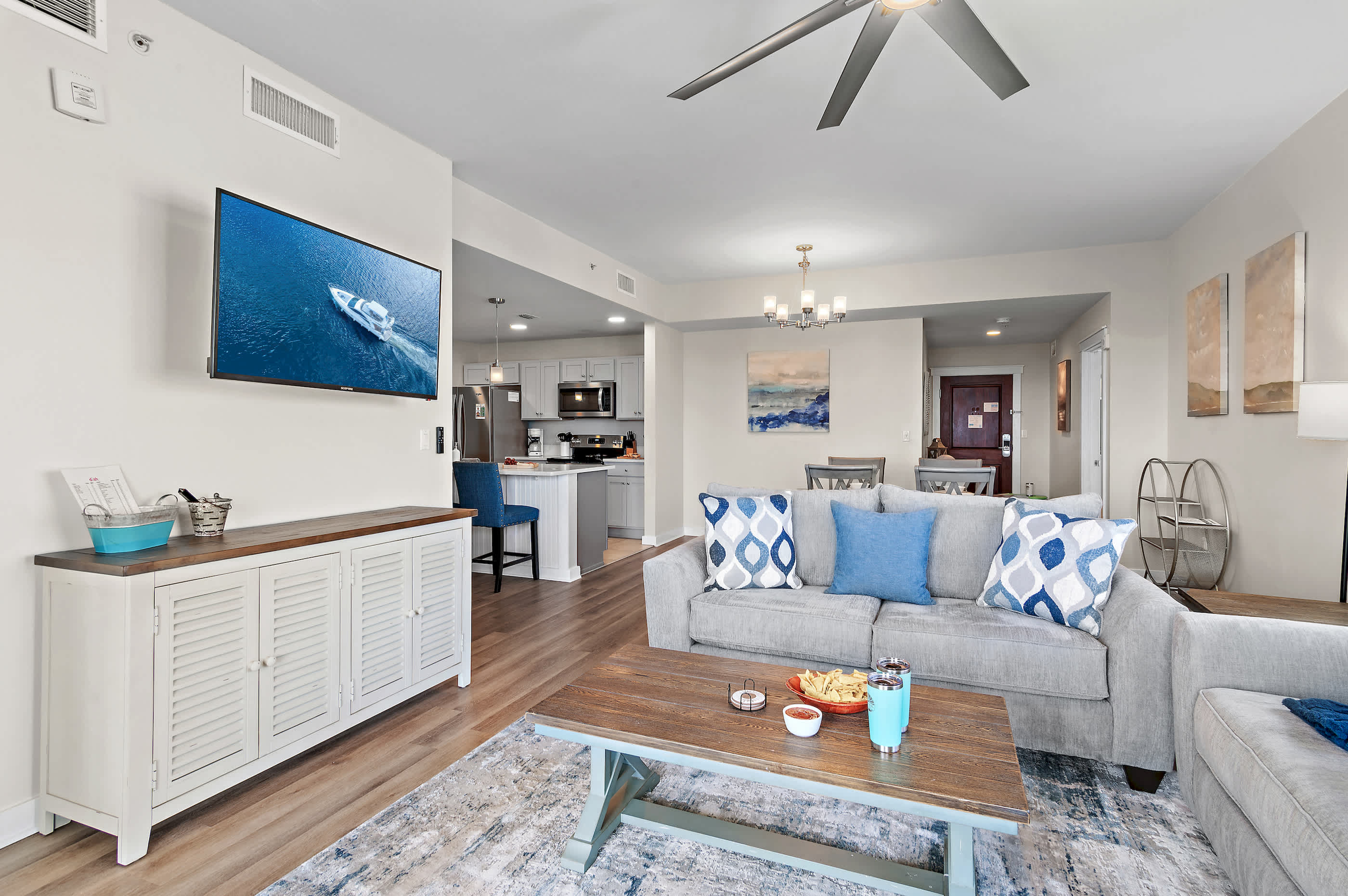 The open-concept living area connects seamlessly to the dining space and fully equipped kitchen, making it easy to gather, cook, and relax together. The kitchen includes a dishwasher, oven, and everything you need for meals at home. The living room features a sleeper sofa and balcony access, offering additional sleeping space and beautiful views.