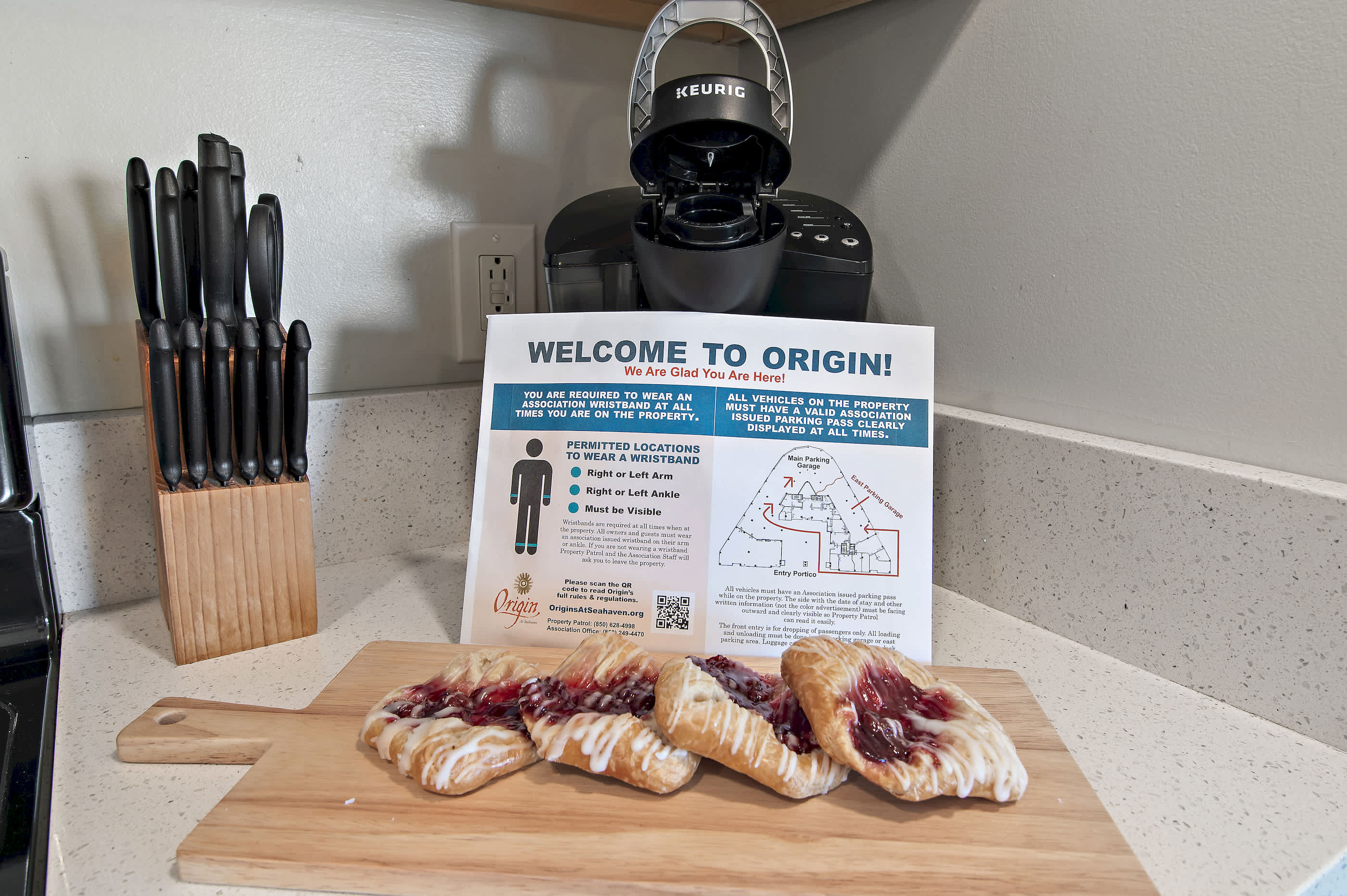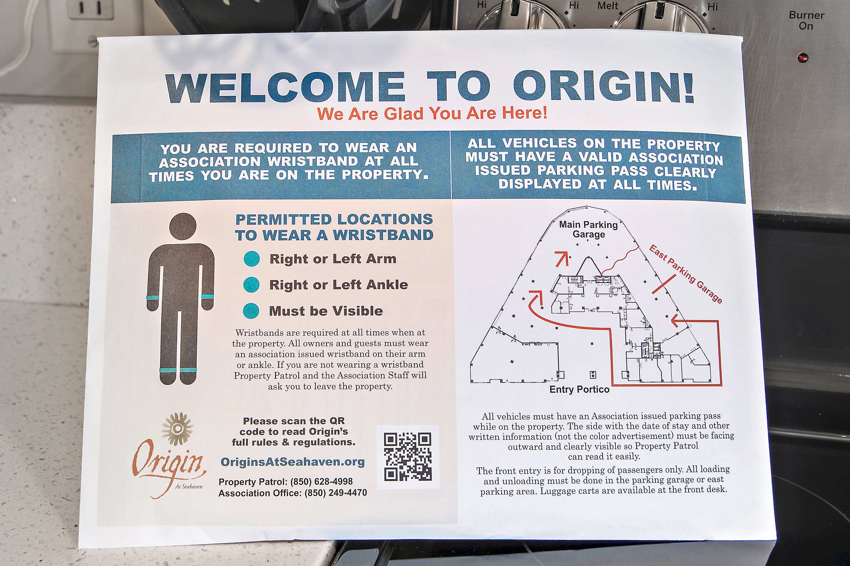 A one-time $65 amenity package fee includes parking passes, wristbands, and access to community amenities. This package is picked up at the front desk upon arrival.